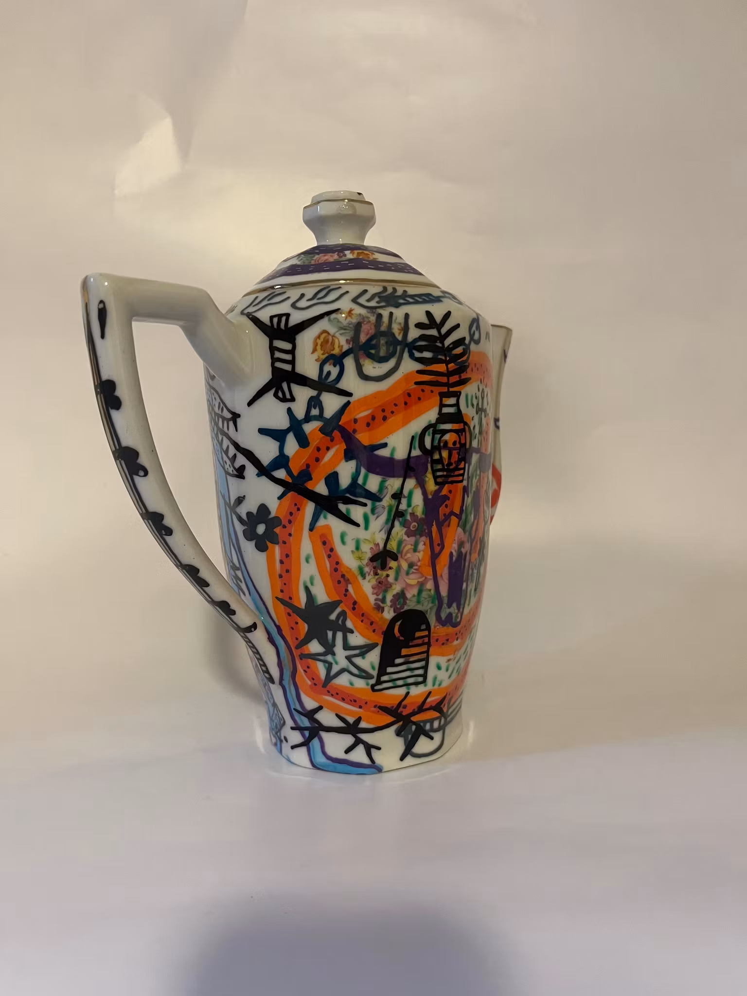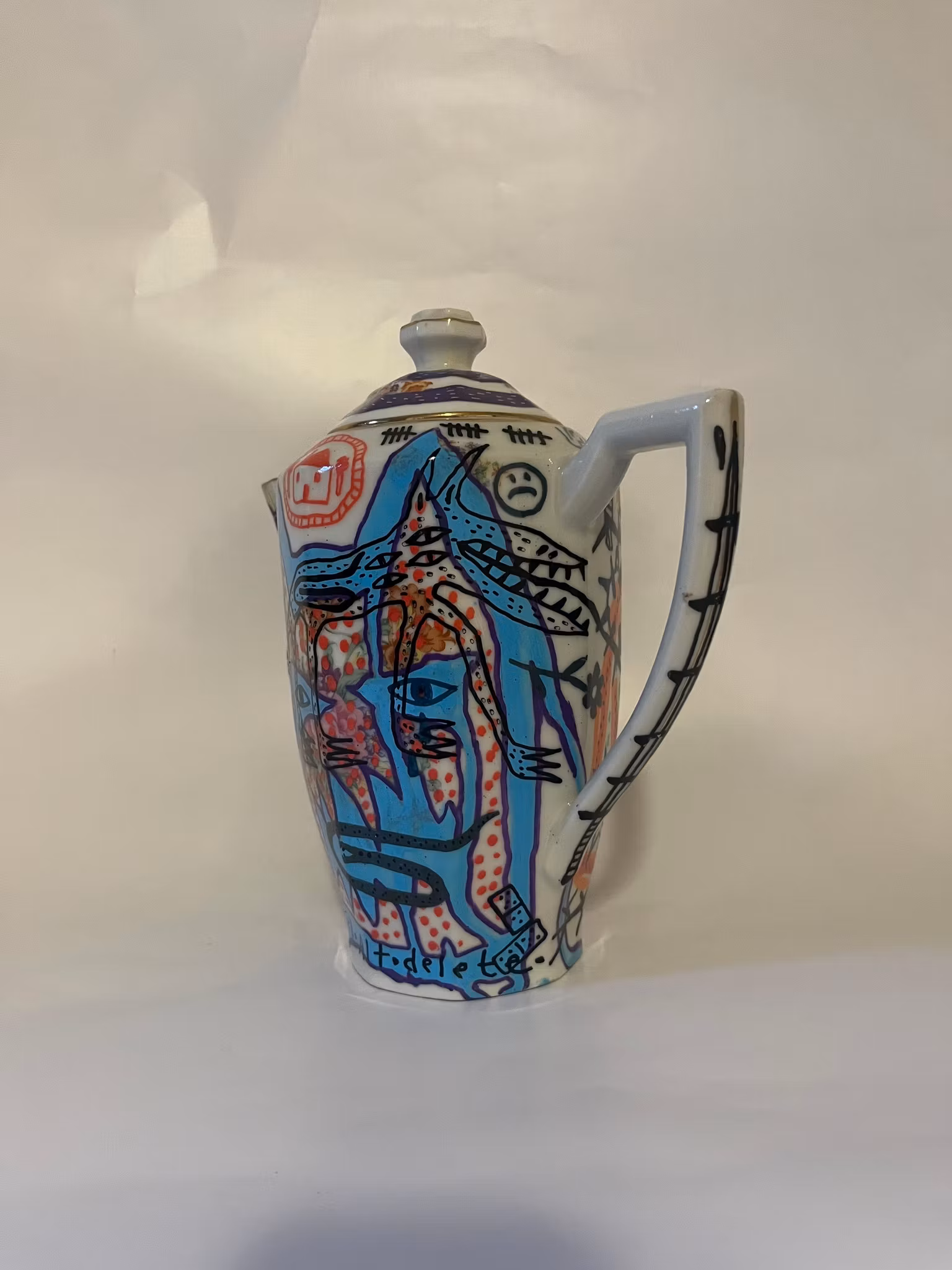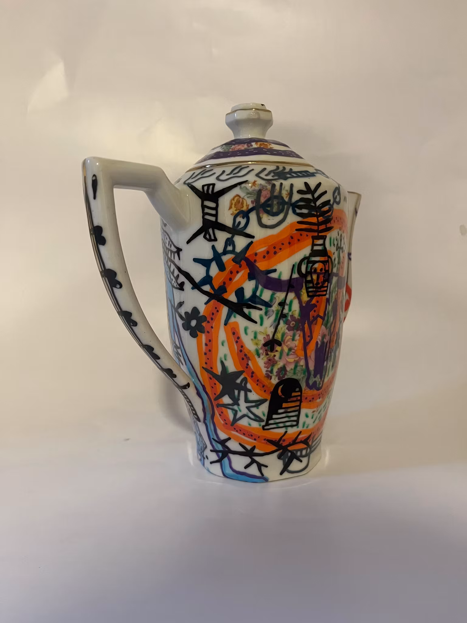 tekanna köpt på secondhand, ritad med poscapennor, bränd i ugn, lackad med porslinslack o bränd i ugn igen