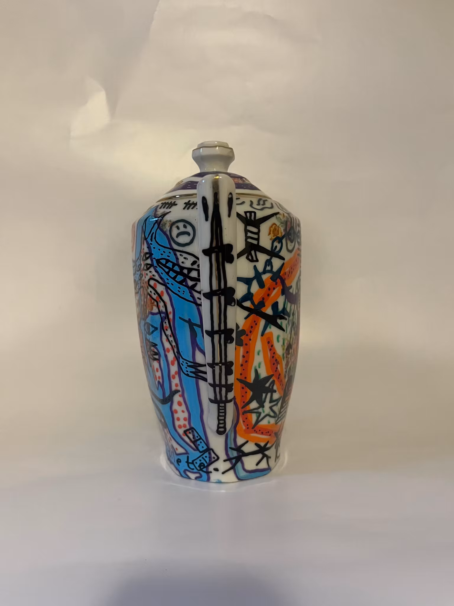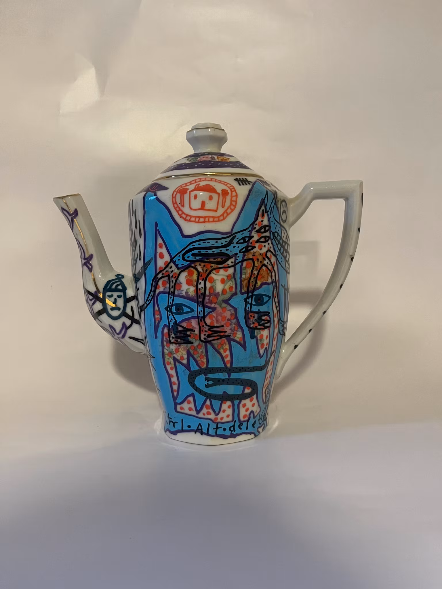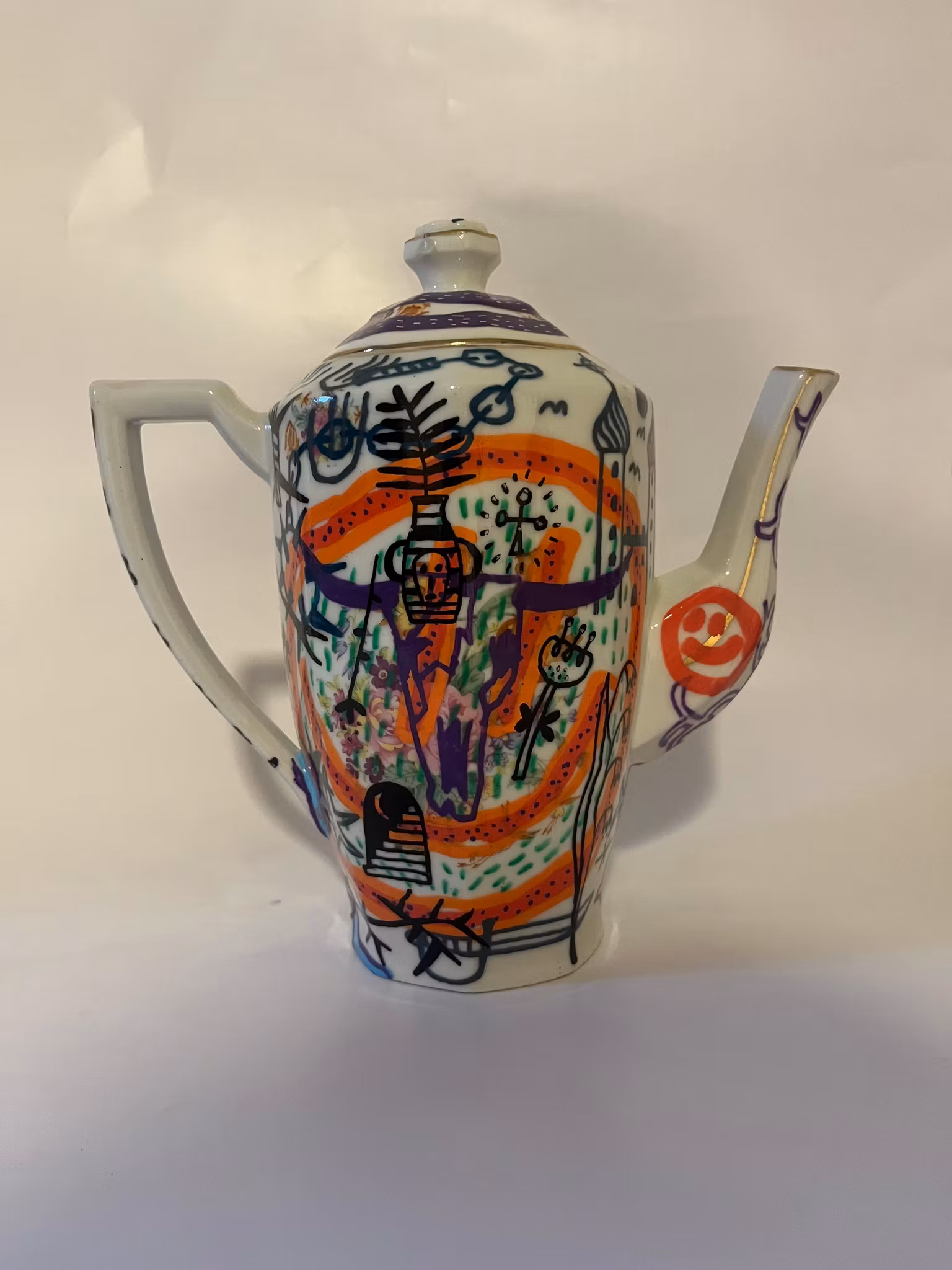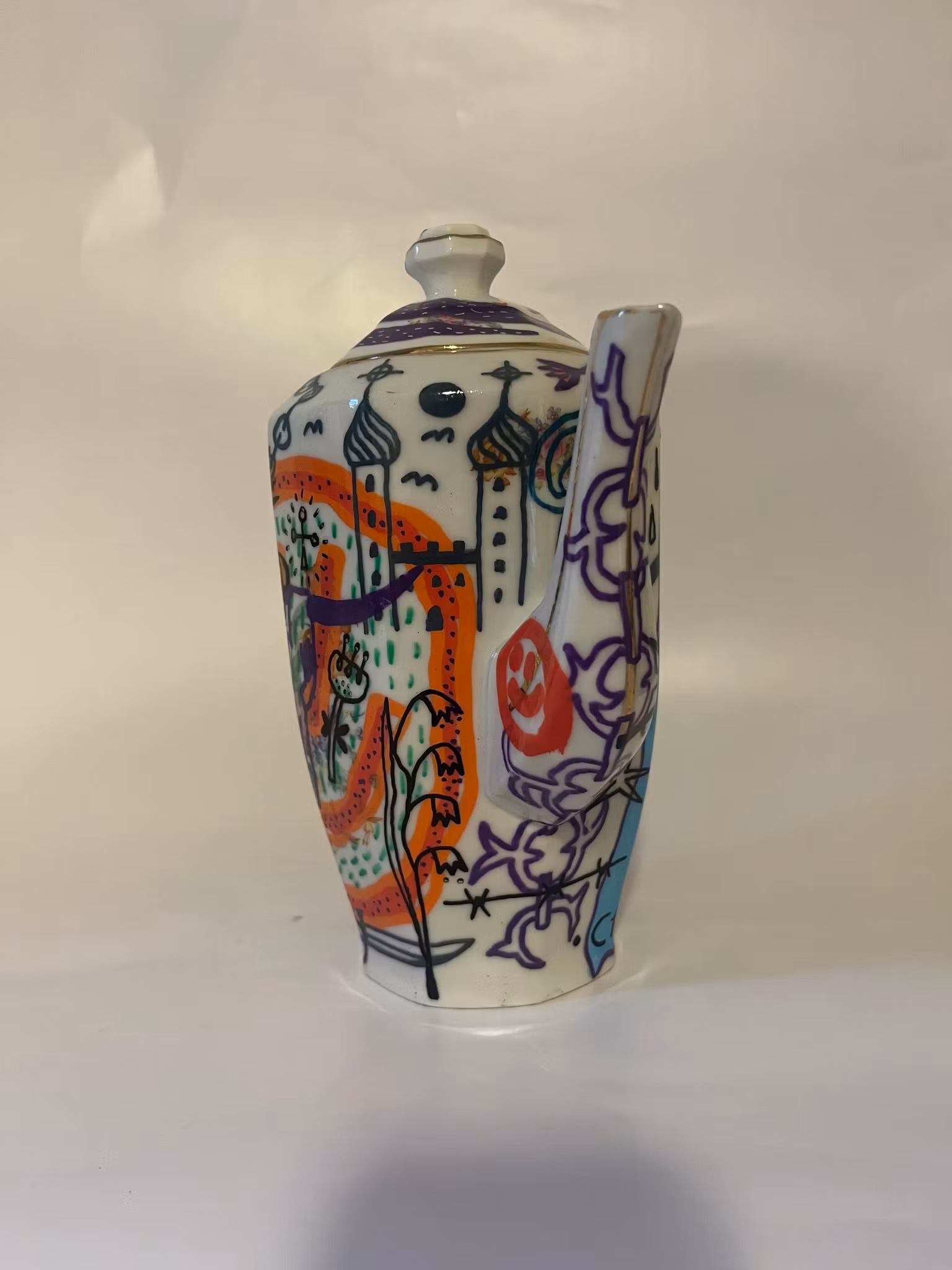 tekanna köpt på secondhand, ritad med poscapennor, bränd i ugn, lackad med porslinslack o bränd i ugn igen