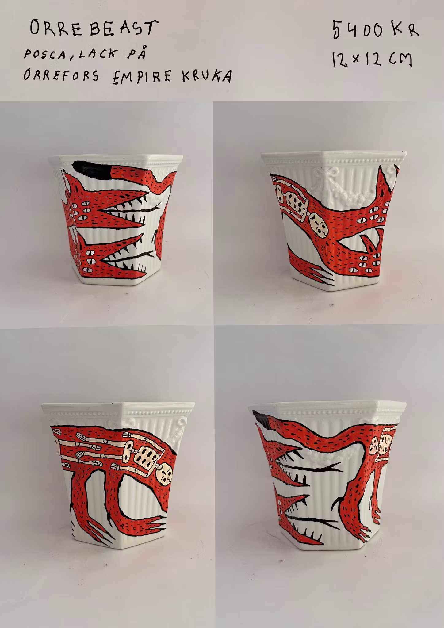 orrefors "empire" kruka köpt på secondhand, ritad med poscapennor, bränd i ugn, lackad med porslinslack o bränd i ugn igen