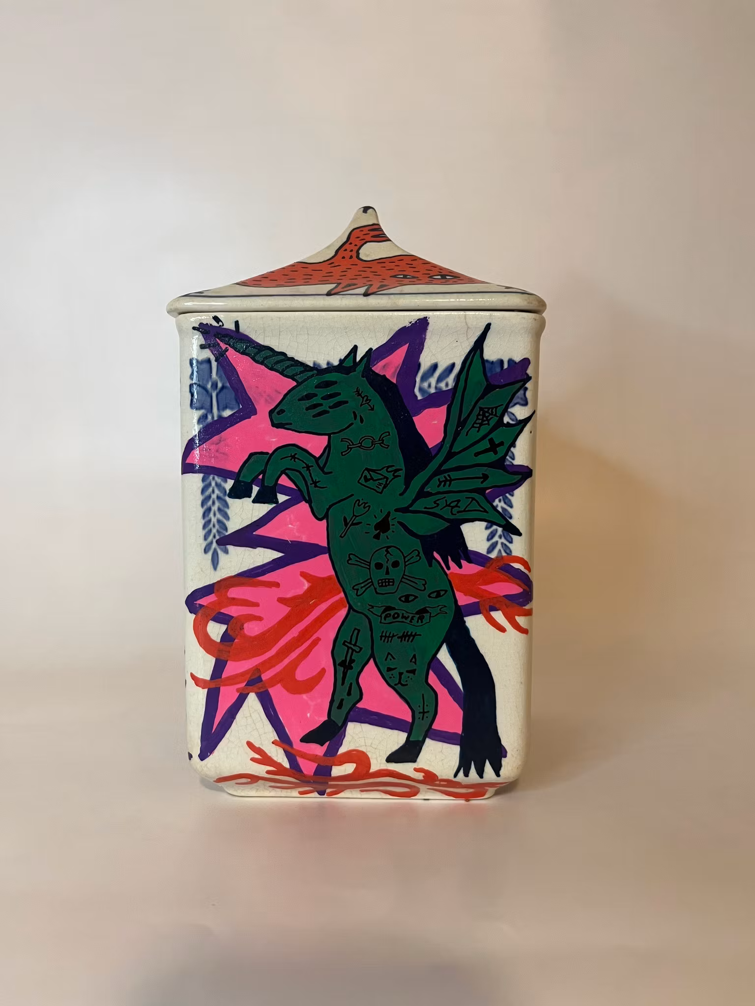 porslinsburk burk köpt på secondhand, ritad med poscapennor, bränd i ugn, lackad med porslinslack o bränd i ugn igengår att handdiskamått:höjd 16cm , bredd